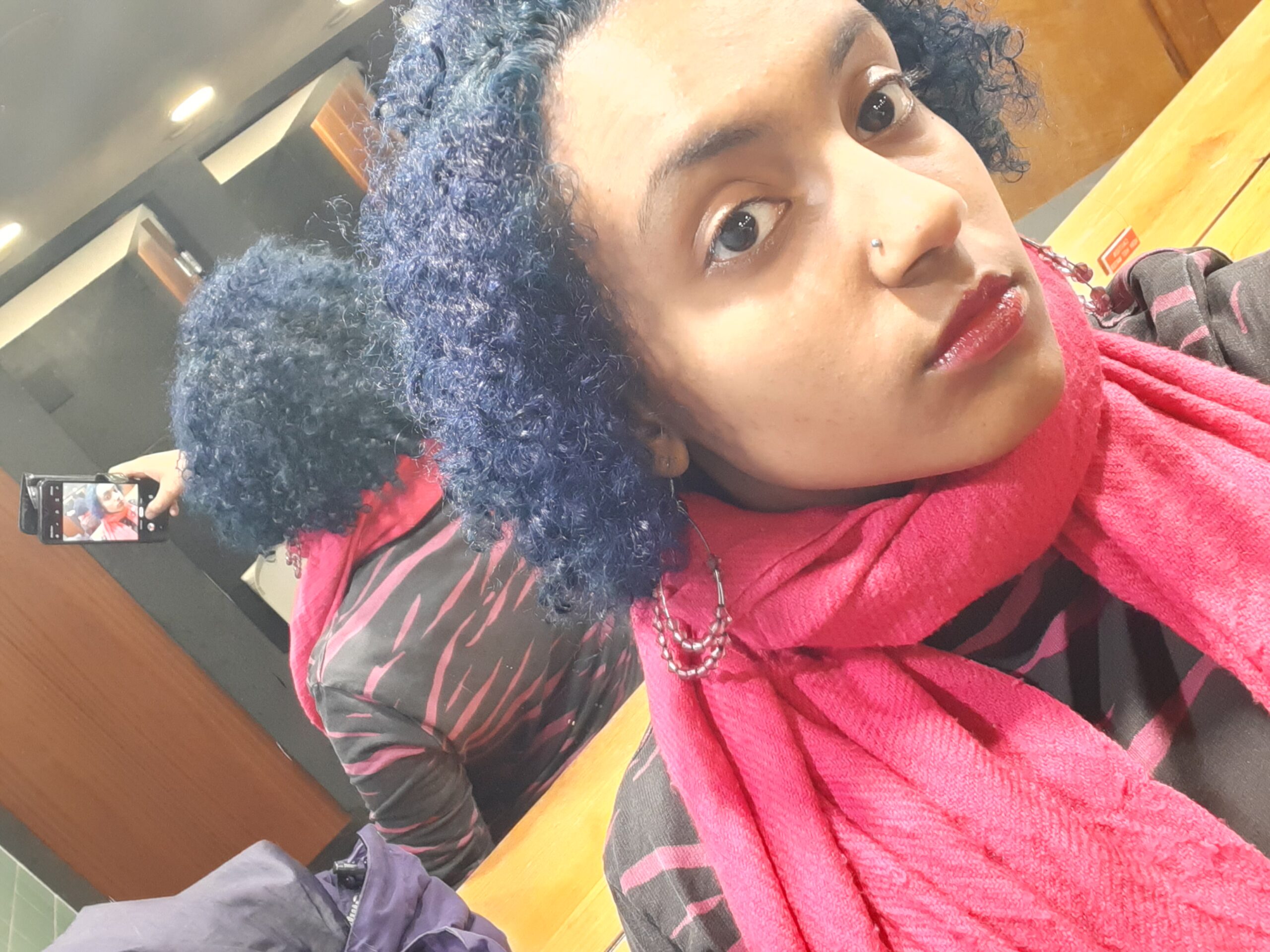Later, in October, I decided I REALLY wanted to get my hair dark blue, and did lots of research about how best to go about it. I bleached my brunette curls FOUR TIMES over THREE DAYS, and applied semi-permanent blue dye. I initially wanted blue-black, but if you apply blue-black dye to dark locks, it WILL just go black. This is because dark hair has red hues which cancel out the blue. Blue only comes through on blonde, so I used a toner in between to make my curls more dark-blonde and less orange. Worked like a charm (although it was a PAIN).
